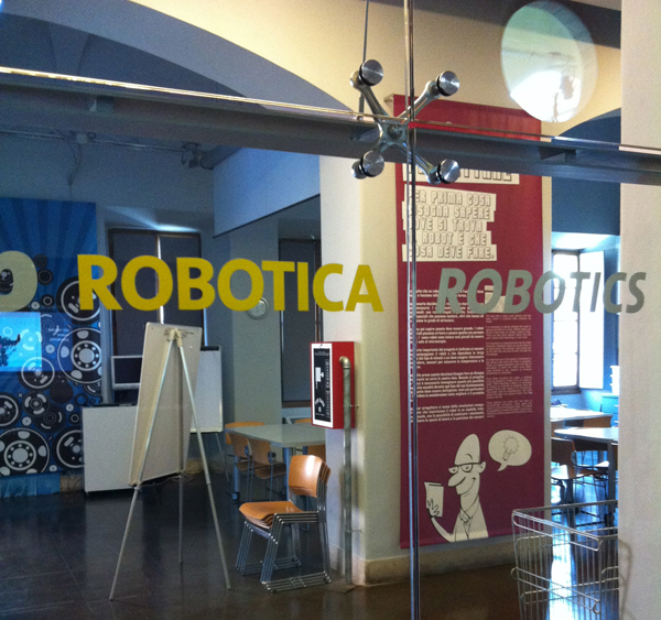 到達門口後實在很難讓我想像這就是達文西博物館,直到看到那布做的招牌如上圖,其他付之闕如。入內學生門票七歐,不算太貴。進去兩側是很多實驗室,有奈米科技、機器人等等不同主題,如下圖,不知是否有讓民眾報名參與些什麼課程,但當天這些實驗室都是關閉的,售票處也沒有告知我們今天的展示是有限的,所以直接跳過。