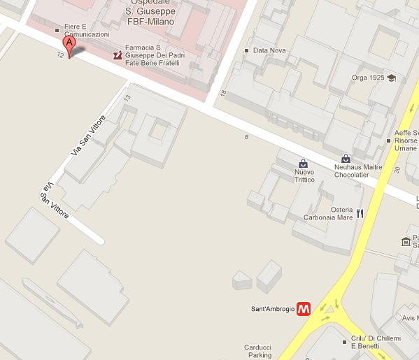 到米蘭這麼久,現在才想到去達文西"科技"博物館,感覺對設計界偶像達文西非常不敬,於是在杜蘭蔣不經意地提議下,查了一下營業時間(週一至五 9.30 - 17.00 六日到18.30)和地址(Via San Vittore 21),離綠線San Ambrogio很近,在一家醫院對面如下圖,就決定帶著朝聖的心情去參觀了。其實我一直以為在史卡拉劇院對面的達文西雕像後面就是該博物館,殊不知是市政廳。不過那個帶包頭巾的雕像如果不仔細看,再拿把扇子放到中國,我會以為是孔明本人,但他們也算在軍事上有些共通點。